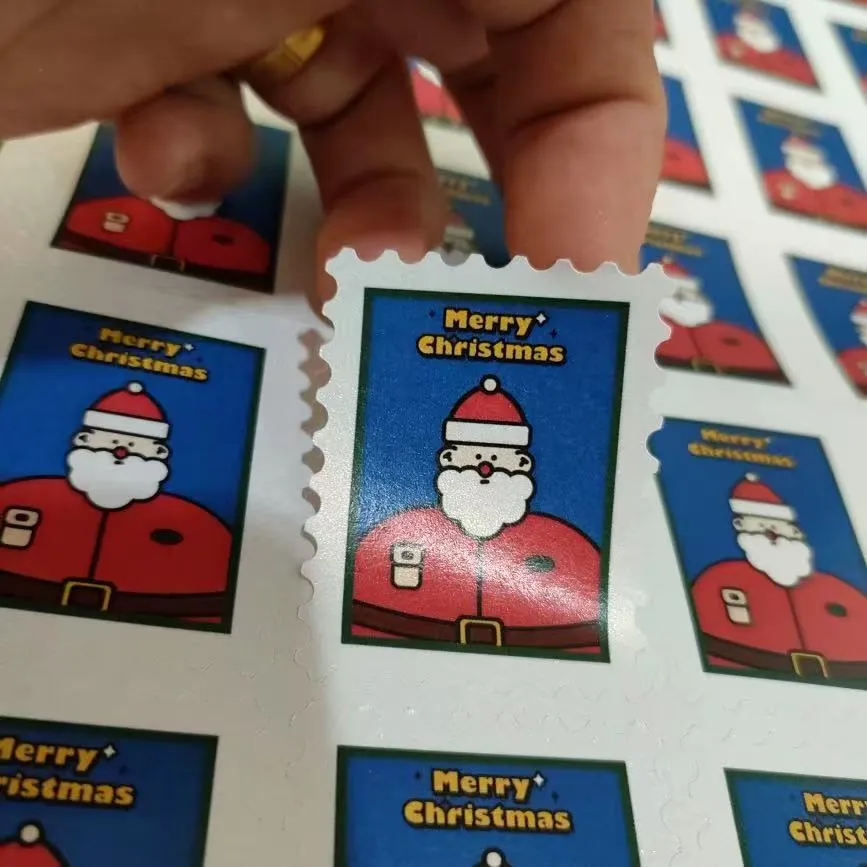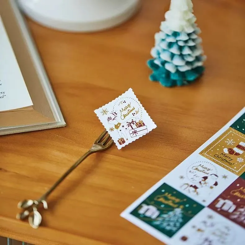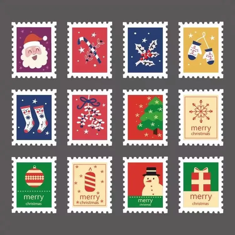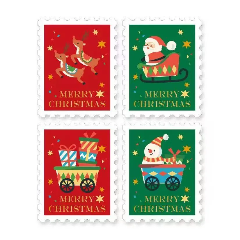 Autocolantele de ștampilă de Crăciun din Jojo Pack prezintă o carte de Crăciun retro ca fundal, prezentând diverse autocolante în stil timbru. Marginile au un efect perforat, oferind un aspect clasic și nostalgic.
