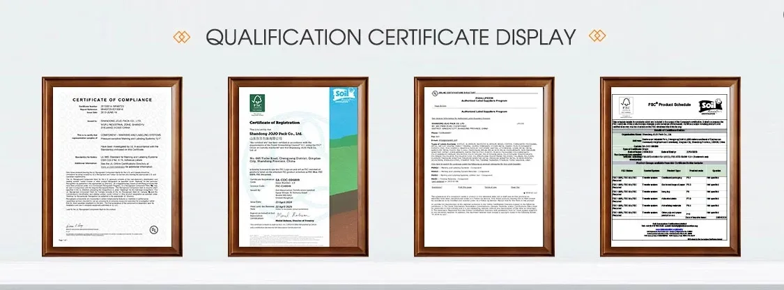 JoJo Pack este un producător de etichete și autocolante cu mai mult de 30 de ani de experiență de imprimare. Compania noastră a obținut certificarea FSC și UL, iar calitatea produselor noastre este pe deplin în conformitate cu standardele internaționale.
