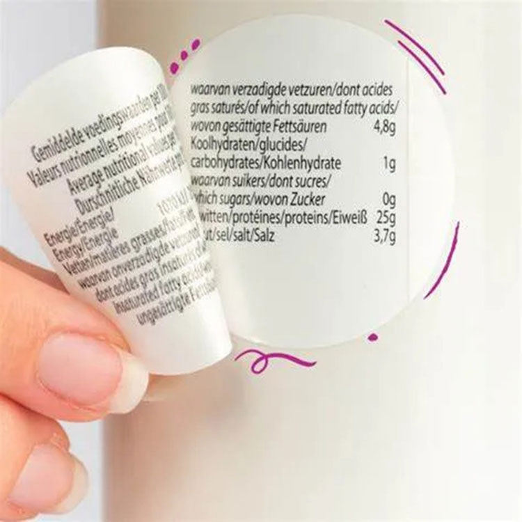 Aceste etichete multistrat pentru alimente sunt fabricate și furnizate de JOJO Pack în China. Aceste etichete sunt stivuite și combinate împreună, părând similare cu etichetele adezive obișnuite din exterior. Cu toate acestea, etichetele pot fi rupte și lipite în mod repetat strat cu strat, la fel ca întoarcerea paginilor unei cărți, permițându-vă să vizualizați conținutul imprimat pe fiecare etichetă.