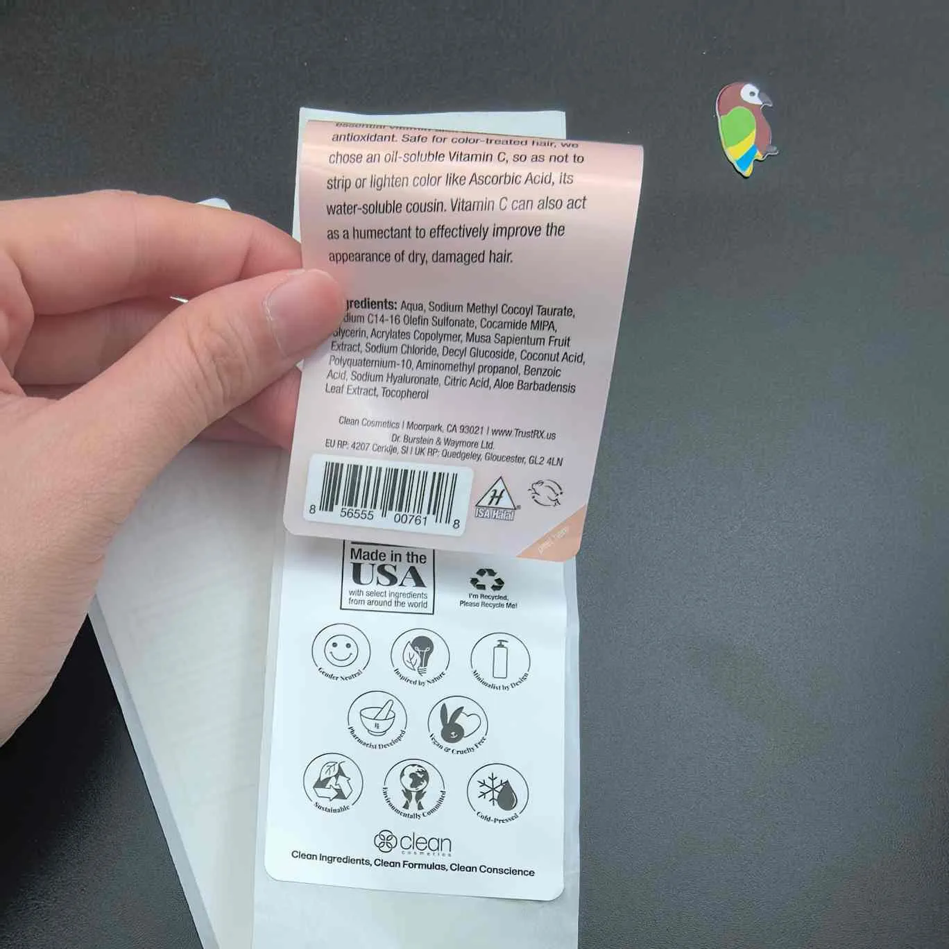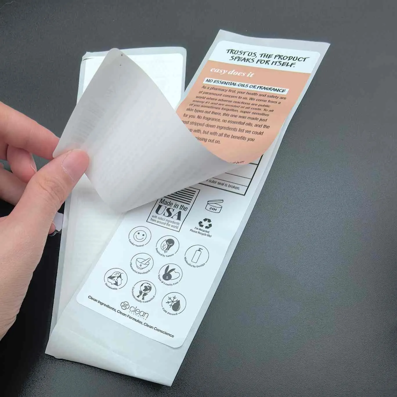R: Este o etichetă cu peste 2 straturi pentru produse cosmetice. Dezlipiți stratul exterior pentru a dezvălui informații suplimentare despre stratul interior fără a extinde dimensiunea etichetei.