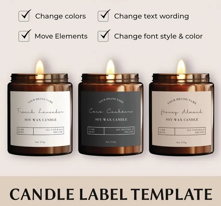 PVC:Oferă durabilitate excelentă și rezistență la intemperii. Etichetele pentru lumânări parfumate din PVC pot fi transformate în etichete transparente sau colorate. Rețineți că PVC-ul nu este biodegradabil, așa că s-ar putea să nu se potrivească mărcilor eco-conștiente.